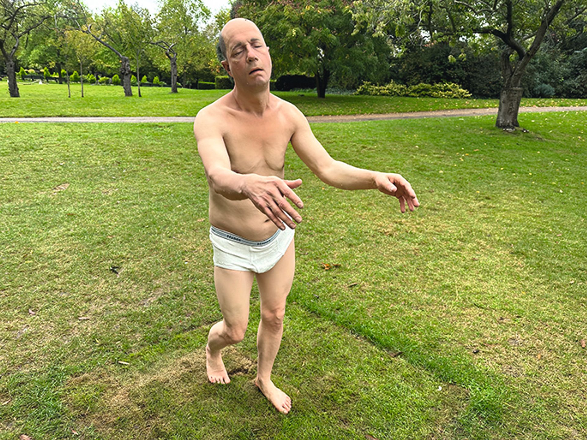 The hyperrealistic sculpture Sleepwalker (2014)—depicting a somnambulating man clad in dishevelled white underpants with outstretched arms—is startling joggers and strollers in Regent’s Park, a few of whom appear to be mistaking the work of artwork for a dozy dude who has wandered off piste. Certainly, artist Tony Matelli’s bare man, a part of Frieze Sculpture, seems to be so genuinely sleepy, some young children have been warned by a cheeky park warden not “to wake him up”.