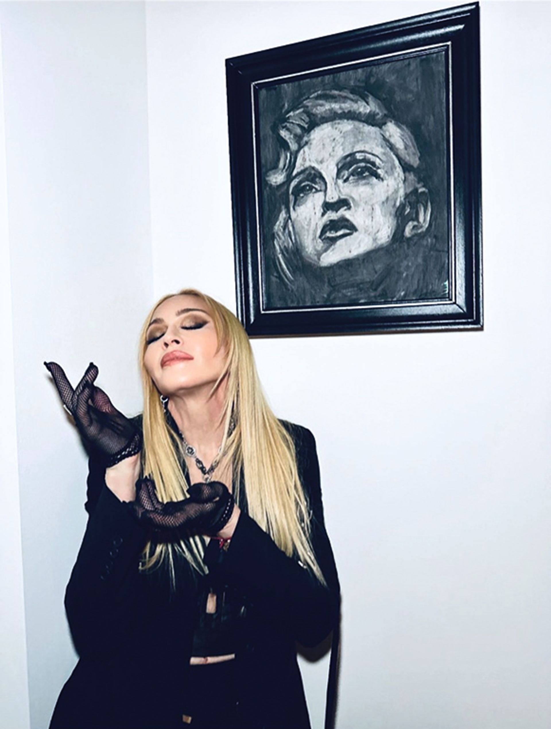Uncanny likeness: Madonna together with her son’s charcoal drawing of her, in an exhibition at a secret venue