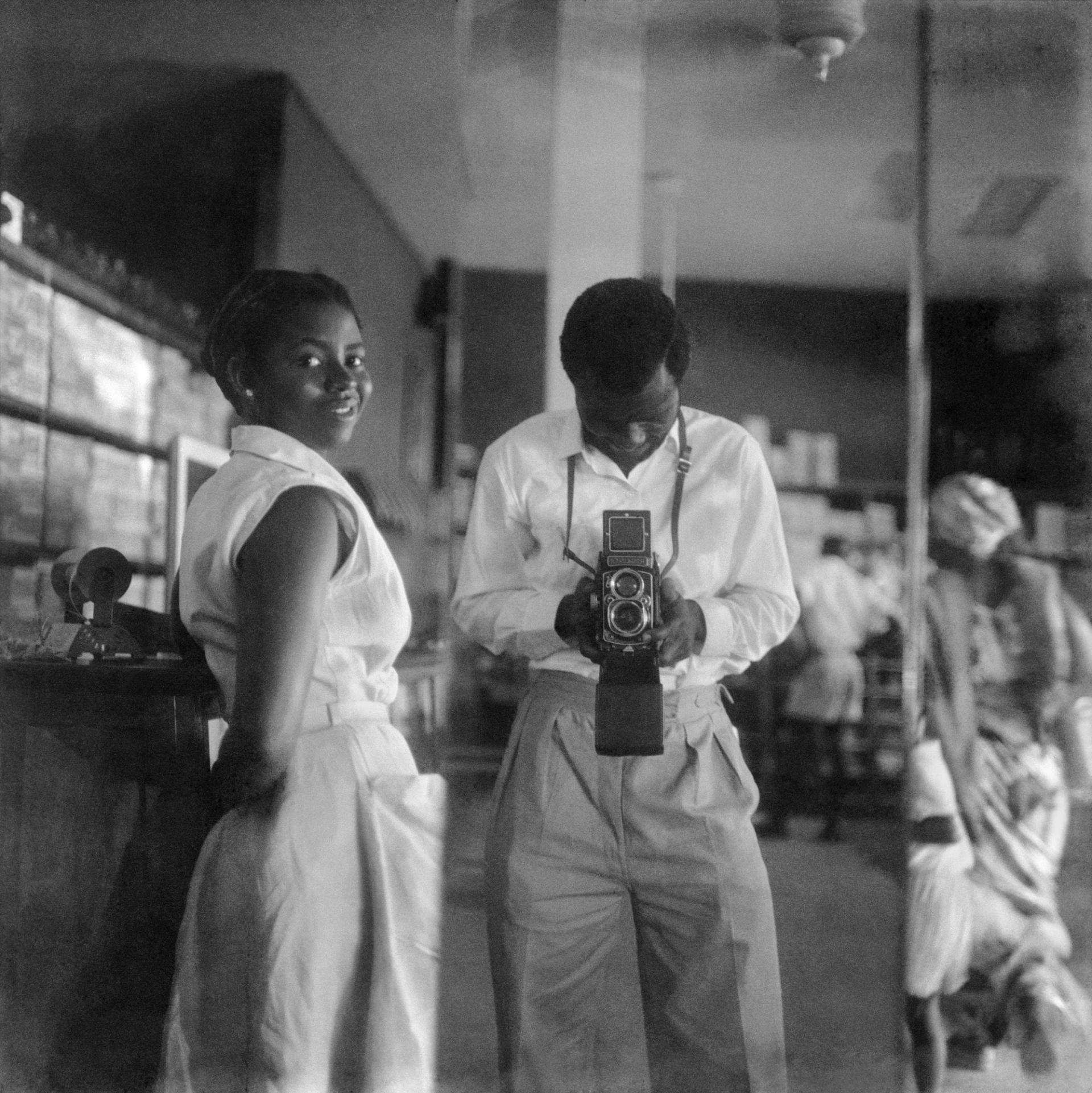 James Barnor, Self-portrait with a store assistant at the West African Drug Company, central Accra (around 1952)