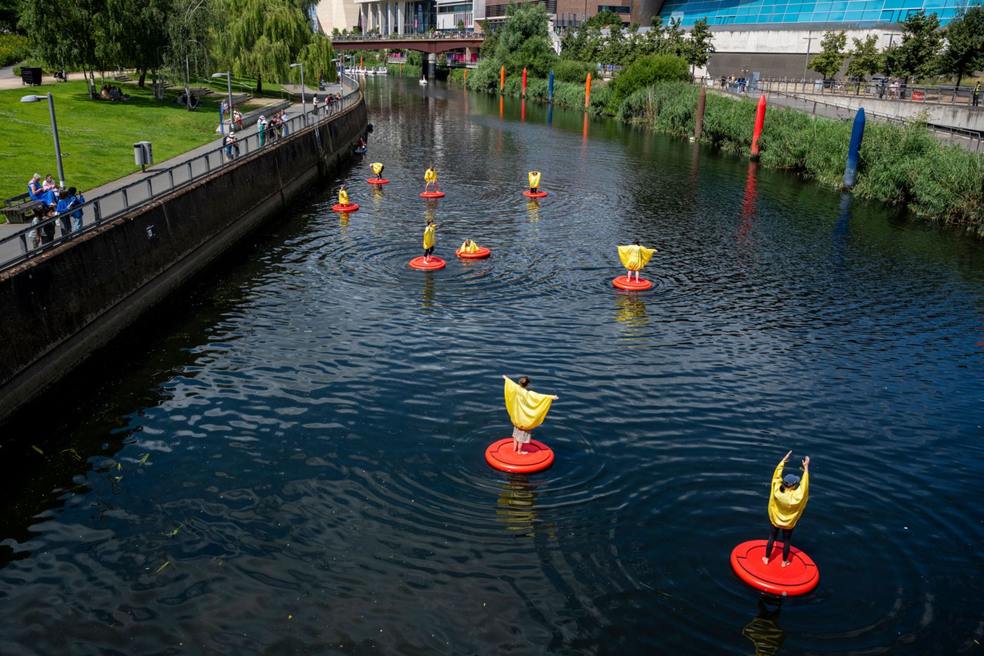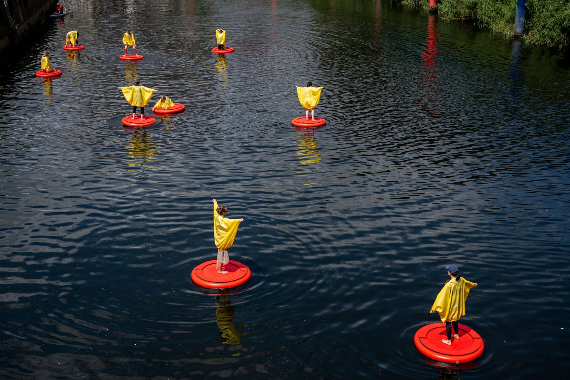 Nine at a time, the participants donned billowing yellow capes (the sails) and stepped out onto red circular paddle boards (the discs) that floated down the Waterworks River for six half-hour performances on 27 July. But with no paddles to steer, they had to trust in the real choreographers of the event—the wind and the water.