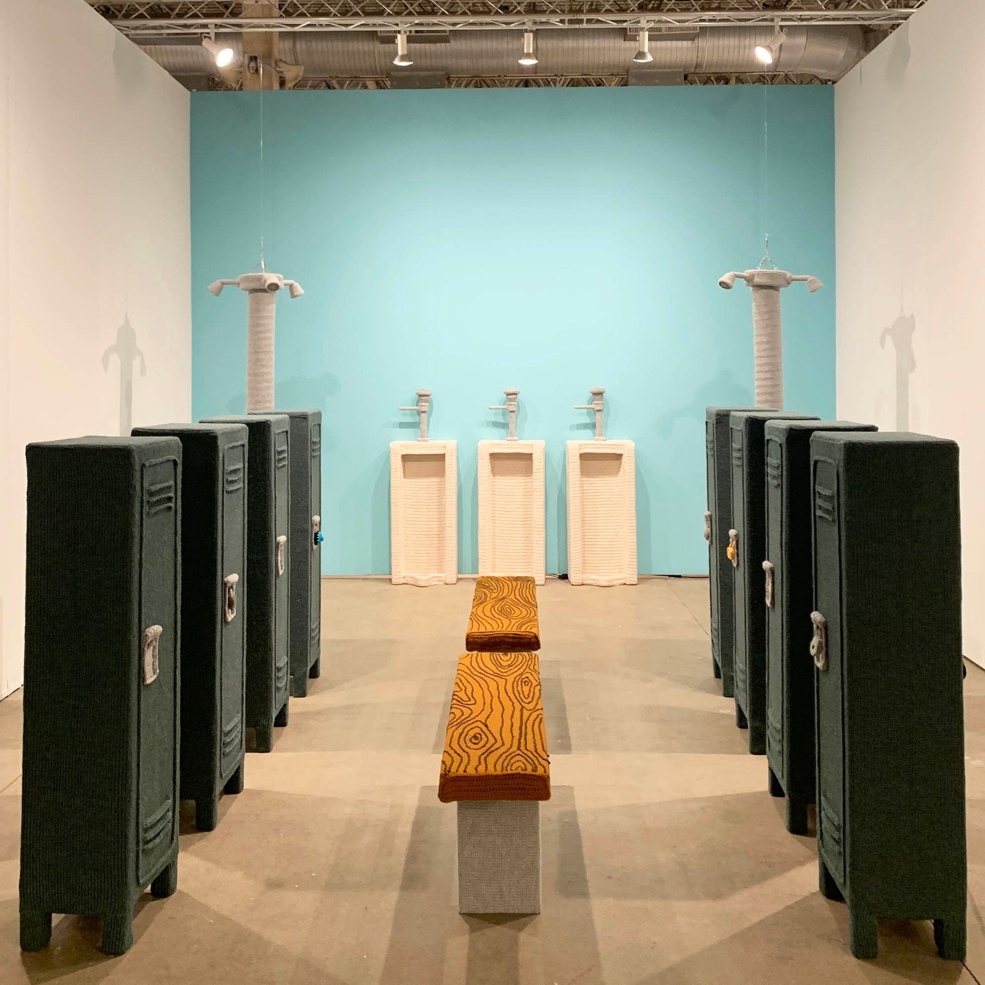 A timely example of all three is taking up the entire stand of Los Angeles-based Walter Maciel Gallery, which is showing Locker Room (2011) by Nathan Vincent. The artist’s life-size re-creation of a generic men’s changing room—complete with benches, showers, urinals and two rows of lockers—is rendered entirely in knitted and crochet elements.