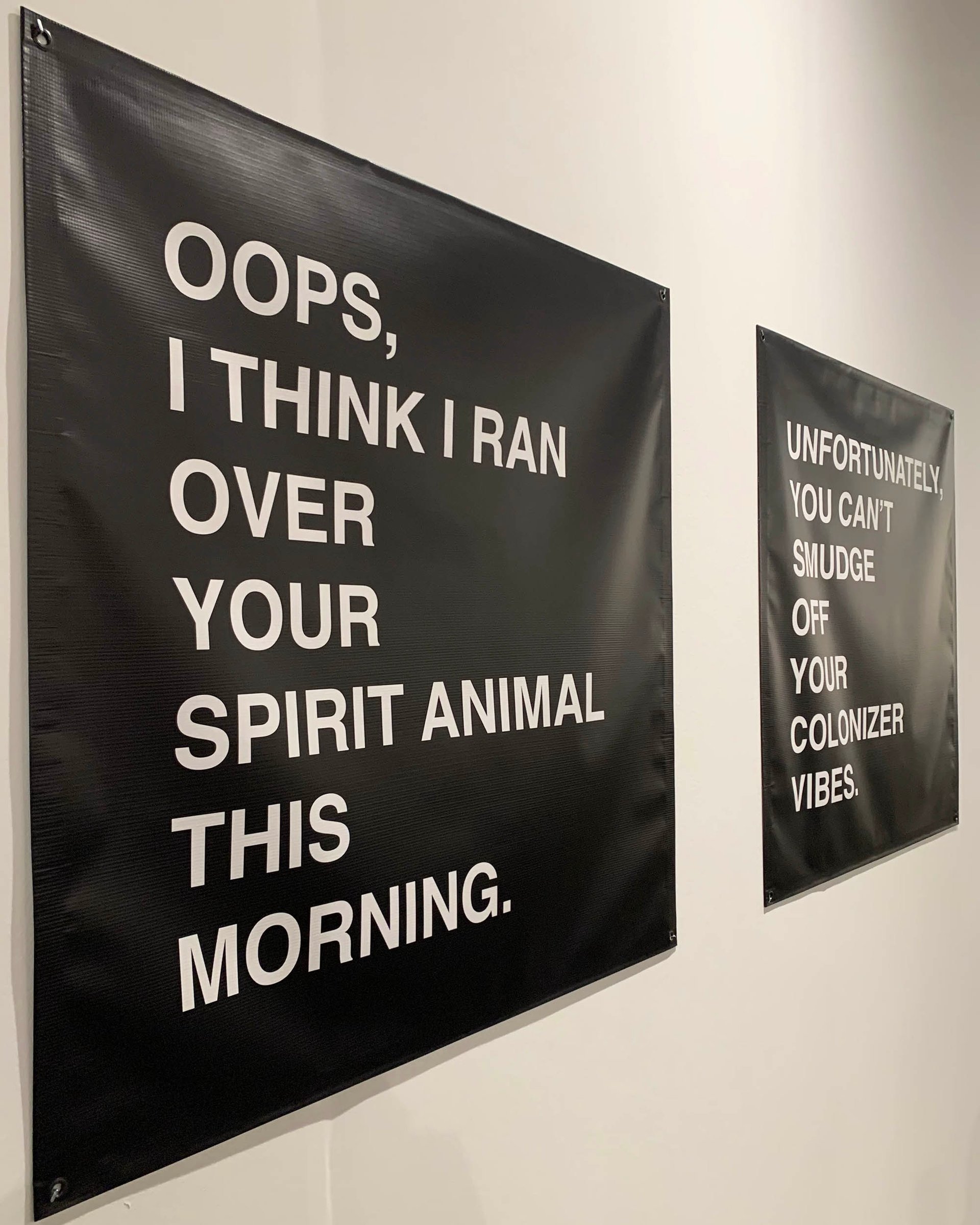 The US president’s policies—on economic, immigration and cultural issues—manifest in several ways across the fair. One exterior wall of the Center for Native Futures stand, for instance, features a series of vinyl banners bearing pointed, irreverent white-on-black text. One reads: “Unfortunately, you can’t smudge off your colonizer vibes.” The works come from a series by the Colorado-based Navajo, Creek and Greek artist Anna Tsouhlarakis titled YOUR REFUSAL TO SEE: A Native Guide Project (2024).