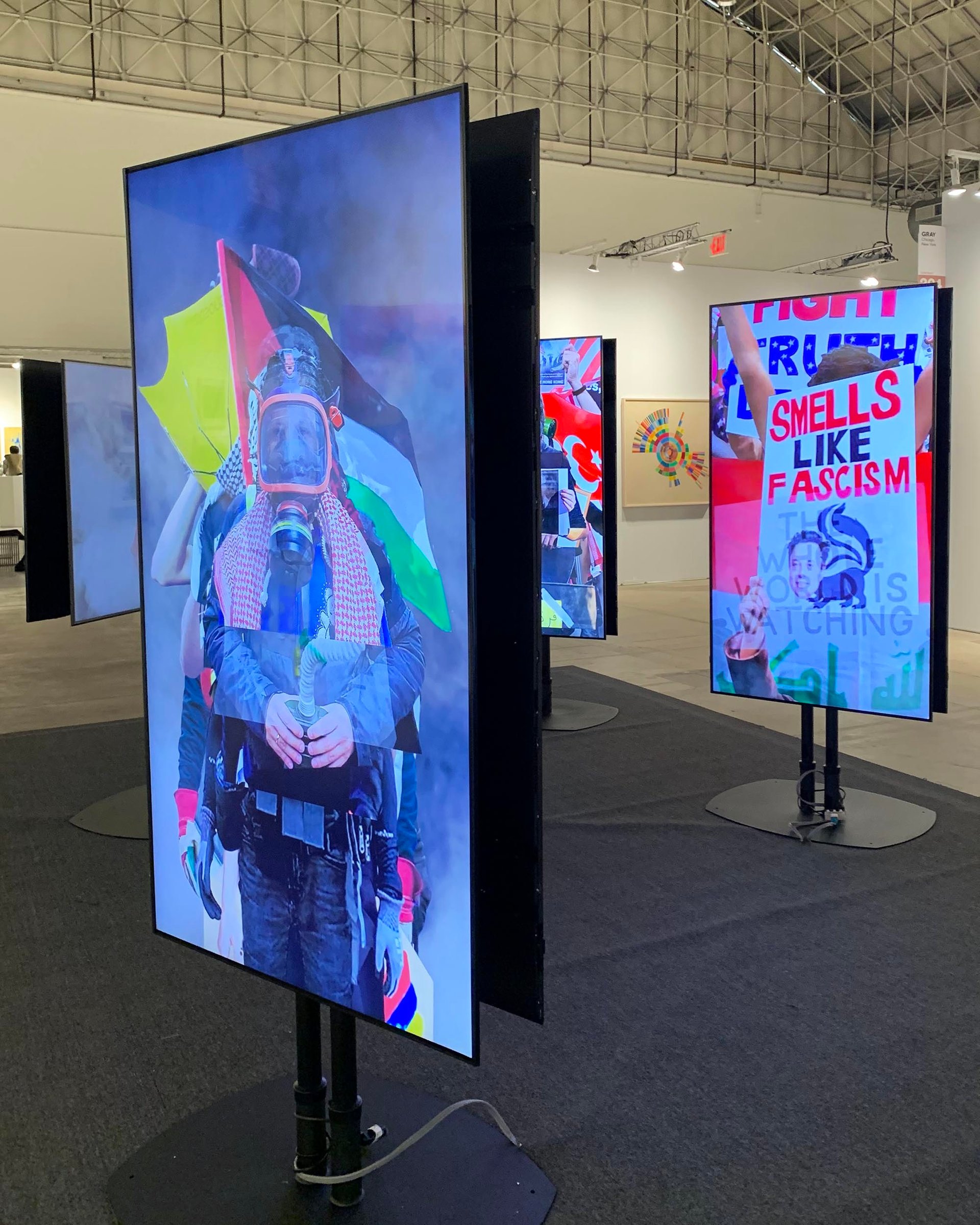 Another arresting installation, which is part of the fair’s In Situ programme of large-scale interventions, is a collaborative video project by Deborah Oropallo and Andy Rappaport, presented by the San Francisco-based Catharine Clark Gallery. Rebellion (2021) features, on five freestanding video screens, a slowly shifting sequence of images of protesters from various demonstrations around the world.
