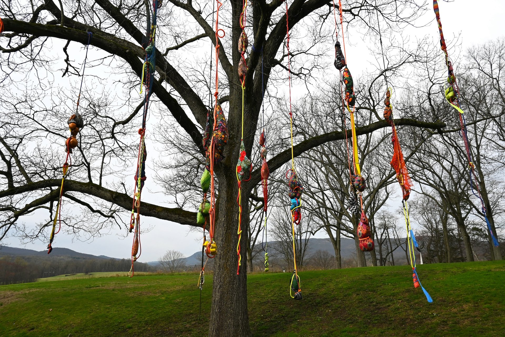 Sonia Gomes has made her first site-specific outdoor work, Ó Abre Alas (2025), specifically for Storm King. It consists of fishing line and other materials suspended from a tree near the sculpture park’s indoor gallery space. Gomes was particularly drawn to Storm King’s trees—she refers to trees in general as “one of God’s greatest art projects”, Lawrence says. Inside the galleries, an exhibition of Gomes’s textile sculptures considers the influence of nature on her art.
