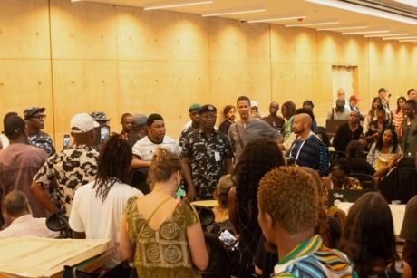Late in the morning, after the first wave of guests had arrived at the venue, a crowd of mostly male protestors wearing red hats appeared at the gate. They shouted that the launch would not continue, claiming “this place is under investigation”. They blocked access to arriving guests while shouting accusations about Godwin Obaseki, the former governor of Edo State, and the construction of MOWAA.