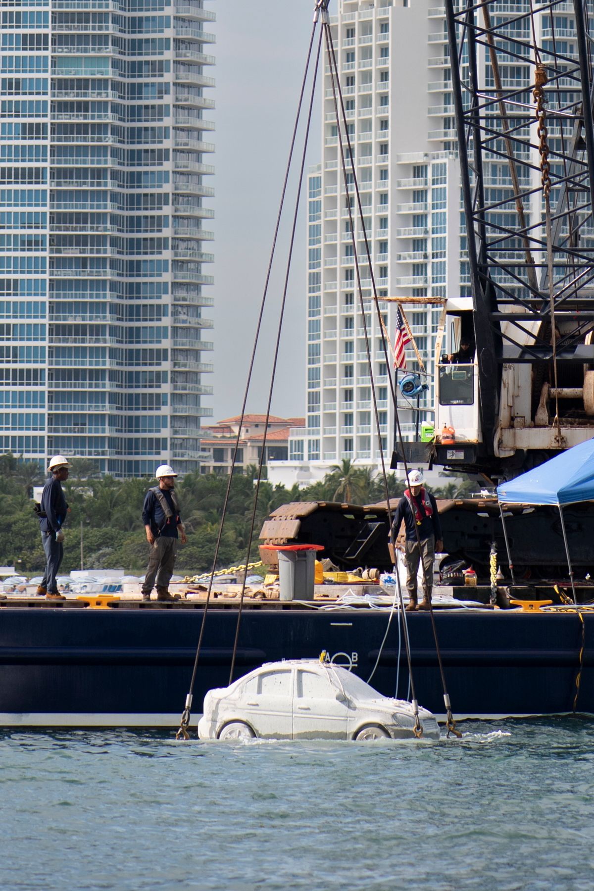 Installation of a sculpture of a car, part of Leandro Erlich’s Concrete Coral, the first Reefline work