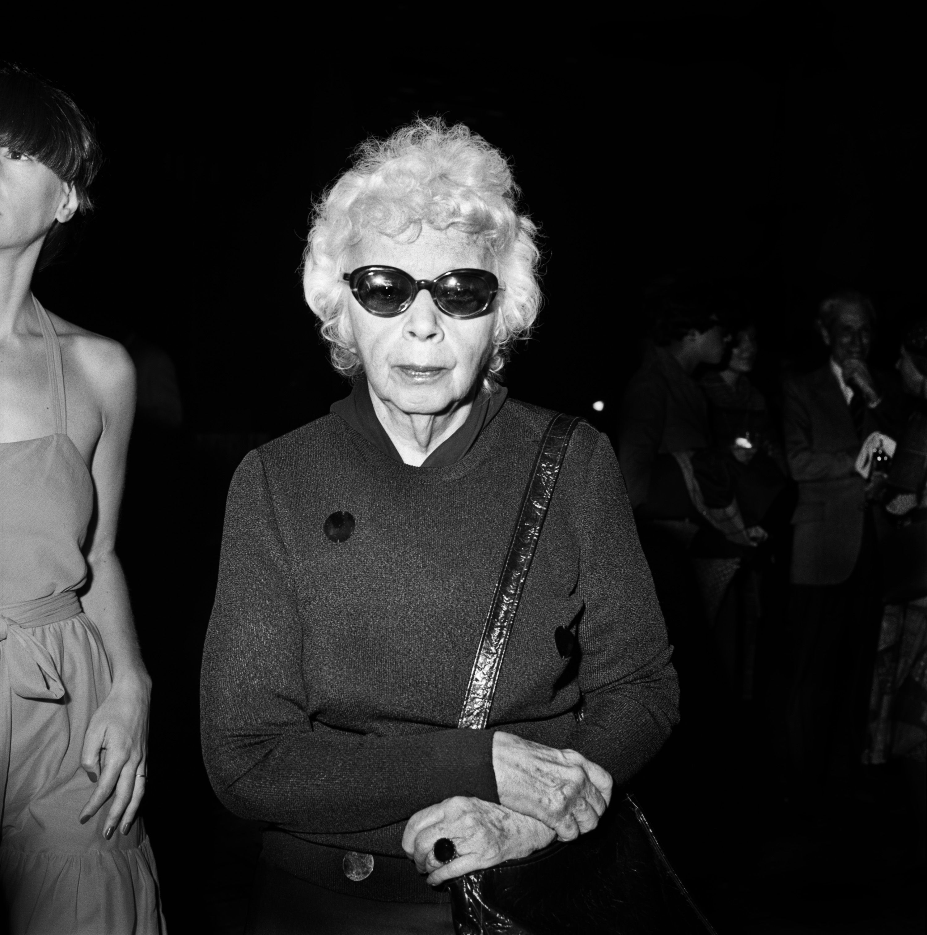 A photo of Lisette Model herself at Brassai’s Marlborough Gallery opening in New York by Rosalind Fox Solomon (1976) © Rosalind Fox Solomon / MUUS Collection
