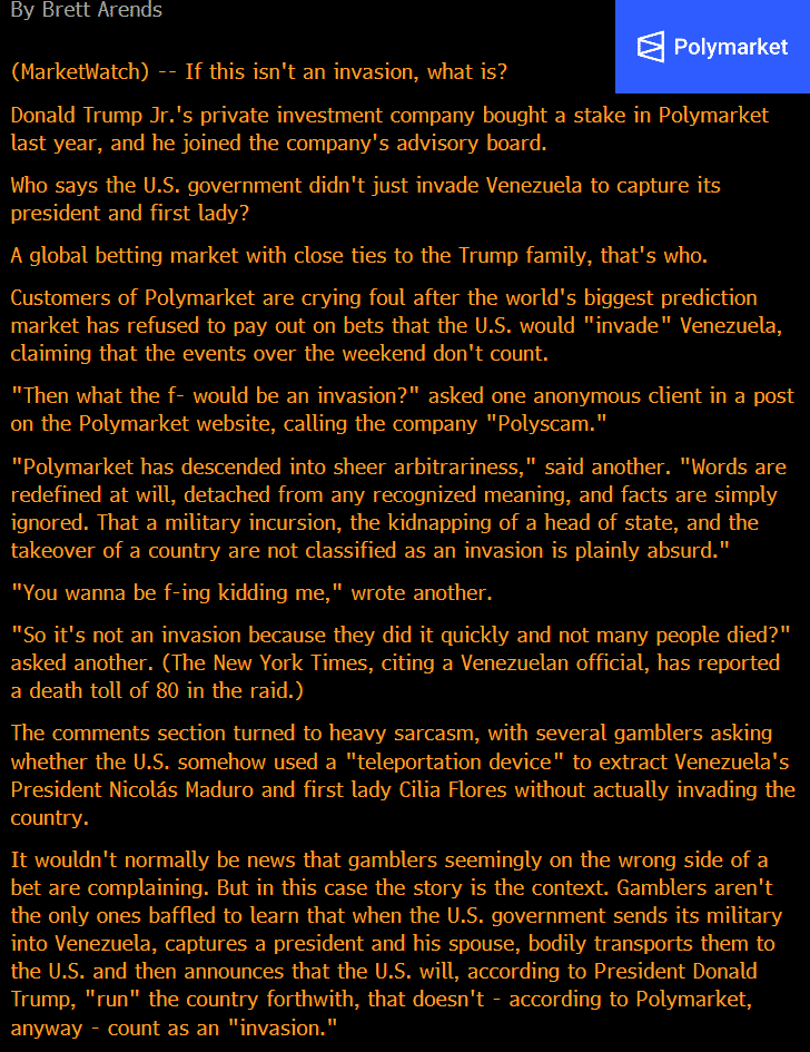 - After US forces captured Venezuela’s Nicolás Maduro Polymarket declared that action didn’t meet its contract’s definition of an “invasion,”