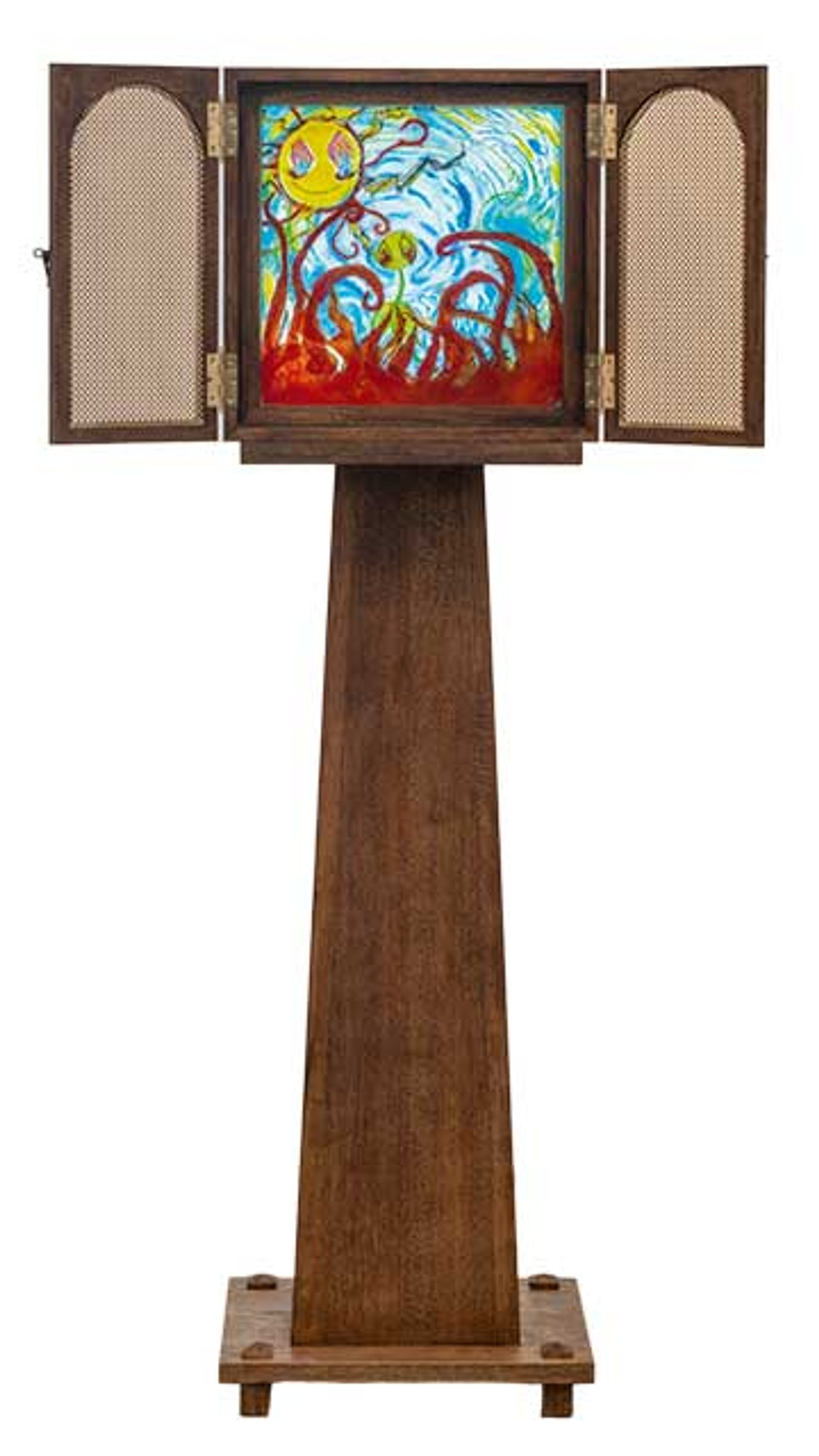 But it is the show’s three dioramas that directly invoke the artist’s experience as a recreational pilot. Painted in oils on glass panes and mounted in light boxes, the scenes depict a burning pastoral world populated by an anthropomorphic sun, flowers and more bears. They combine some of the core themes—our industrially poisoned ecology, the natural world’s resilience and the dire consequences for humanity—that underpinned Okoyomon’s installations at the 2022 Venice Biennale, a 2025 solo show at Austria’s Kunsthaus Bregenz and elsewhere.