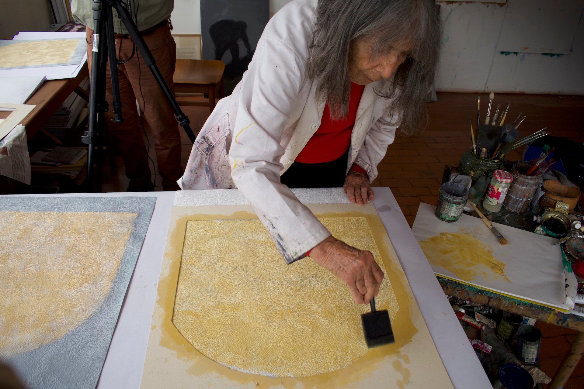 Beatriz González at work in her studio Courtesy Casas Riegner, Bogotá