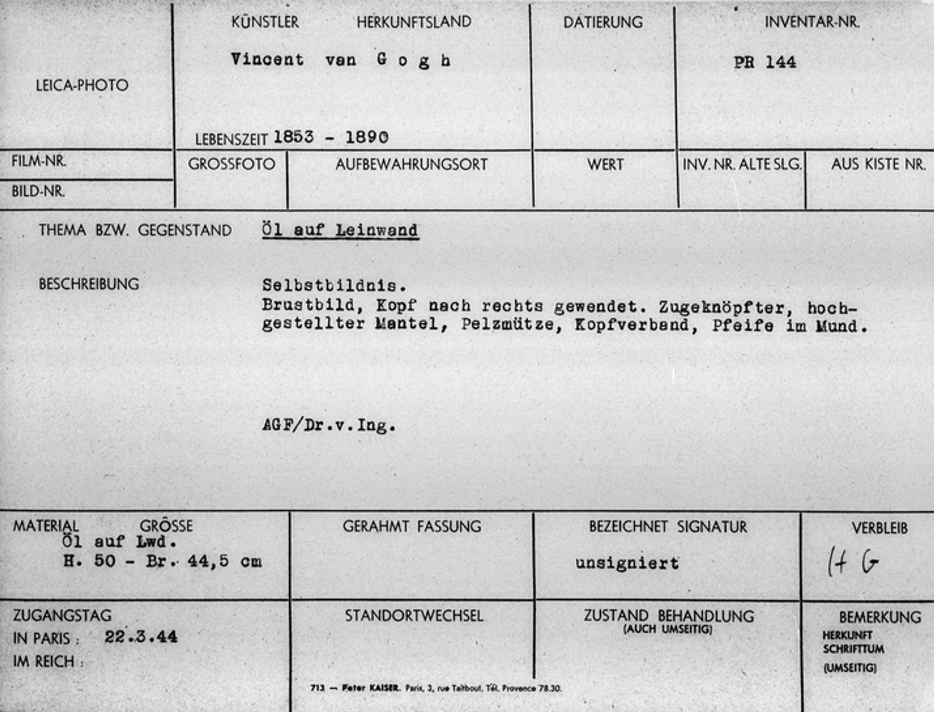 German card recording the arrival of the looted Van Gogh self-portrait in the Jeu de Paume depot, Paris, 22 March 1944