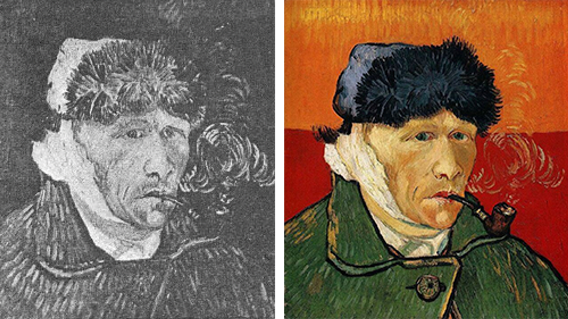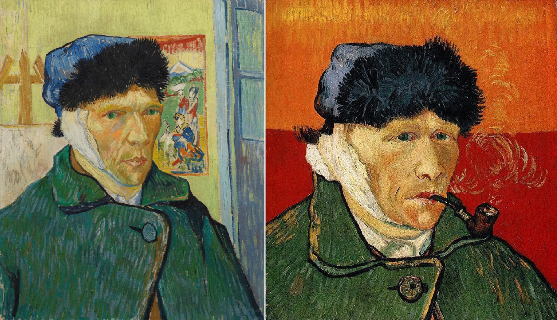 Van Gogh’s Self-portrait with bandaged Ear (Courtauld Gallery, London) and Self-portrait with bandaged Ear and Pipe (private collection, both January 1889)