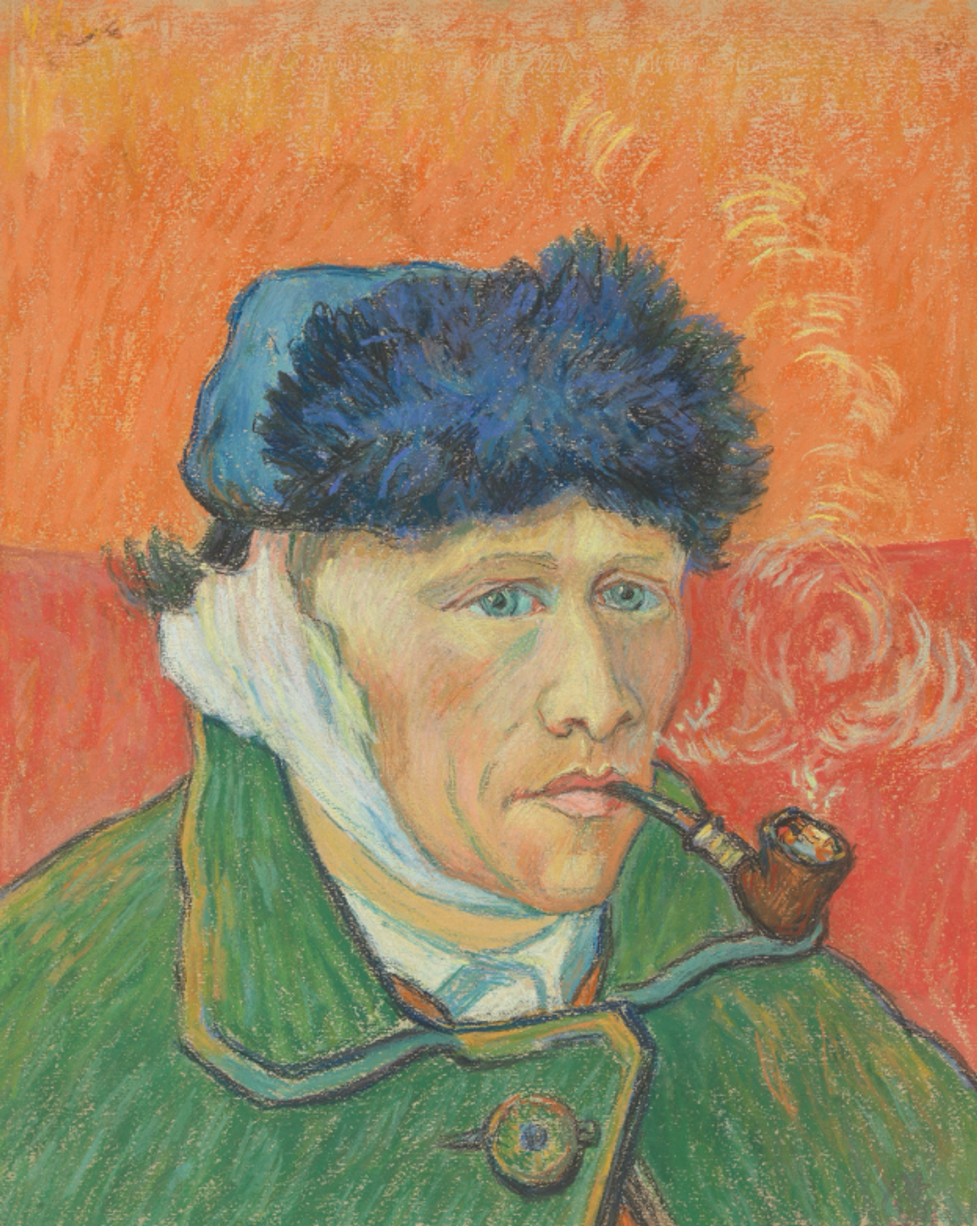 The most striking compositional element of Self-portrait with bandaged Ear and Pipe is the powerful background—orange and red. The division of the colours is level with the artist’s eyes, giving an added emphasis to his direct gaze. With the artist’s coat in green, the complementary colour to red, the picture sings out.