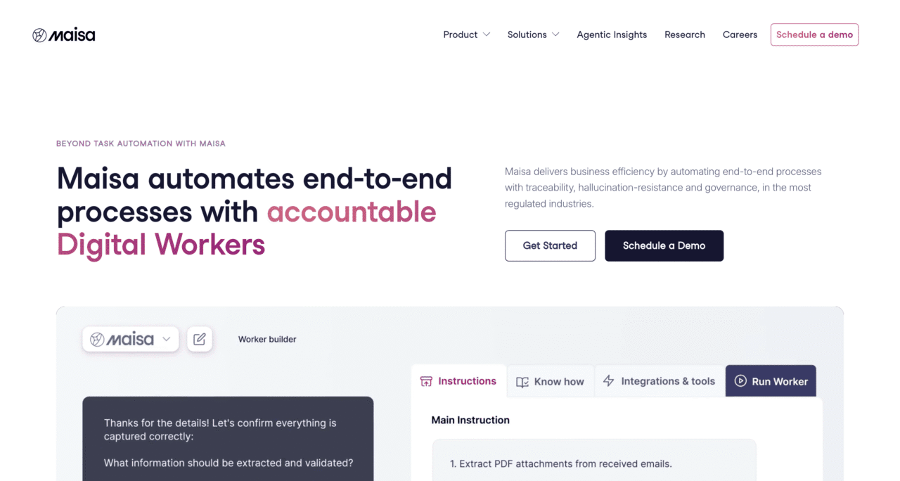 Maisa boosts business efficiency by automating end-to-end processes with traceability, hallucination-resistance, and governance, in regulated industries such as banking and financial services. Maisa was founded in 2024.